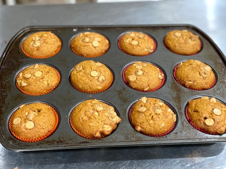 Fill the paper liners about 3/4 full. Top with extra butterscotch chips if desired. I like to use an ice cream scooper.