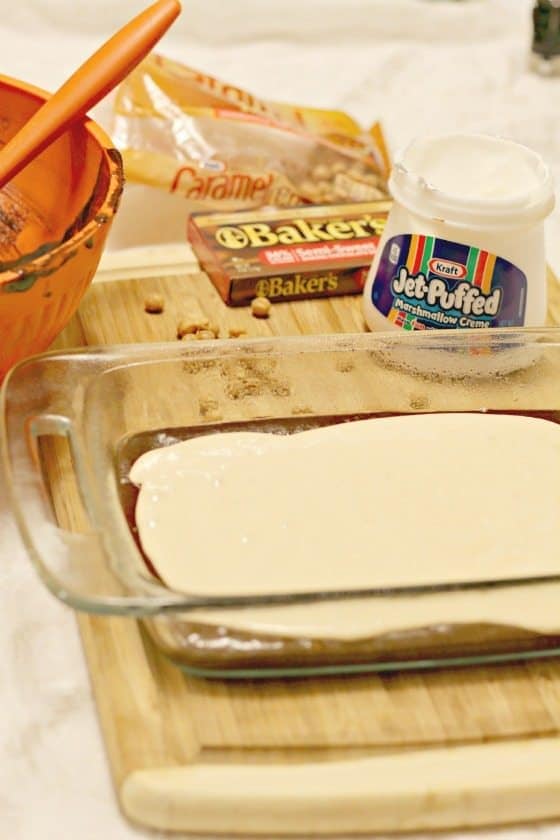 - Pour the marshmallow caramel cream over the brownie batter and then top with dollops of the remaining brownie batter.