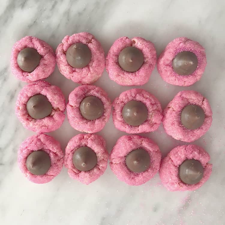 This version is a Valentine Day Cookie. This recipe makes a bunch of cookies and they are very pretty. Plus I really love the combination of chocolate and strawberry. This is also a recipe that your kids will love to make with you. My daughter loves to roll the dough in the sugar and my son like so unwrap all the chocolates for me – and he thinks I dont see him sneak a few as he unwraps them 🙂