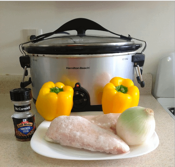 - Add butter, green peppers, onions, chicken, and seasoning into the slow cooker.
