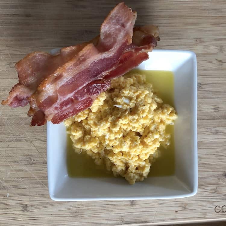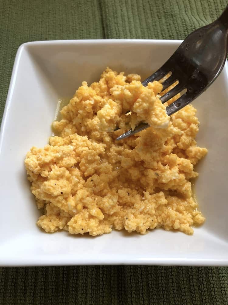 For best results, take your time making this recipe so it doesn’t burn. Use a wooden spoon or rubber spatula to mix the eggs. In the end, it has a cottage cheese type of consistency. It’s a great breakfast!