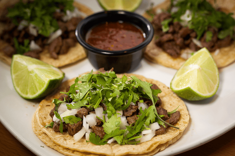 They are usually just a double corn tortilla topped with meat, onions, cilantro, and a salsa. That’s it! Simple and full of flavor!