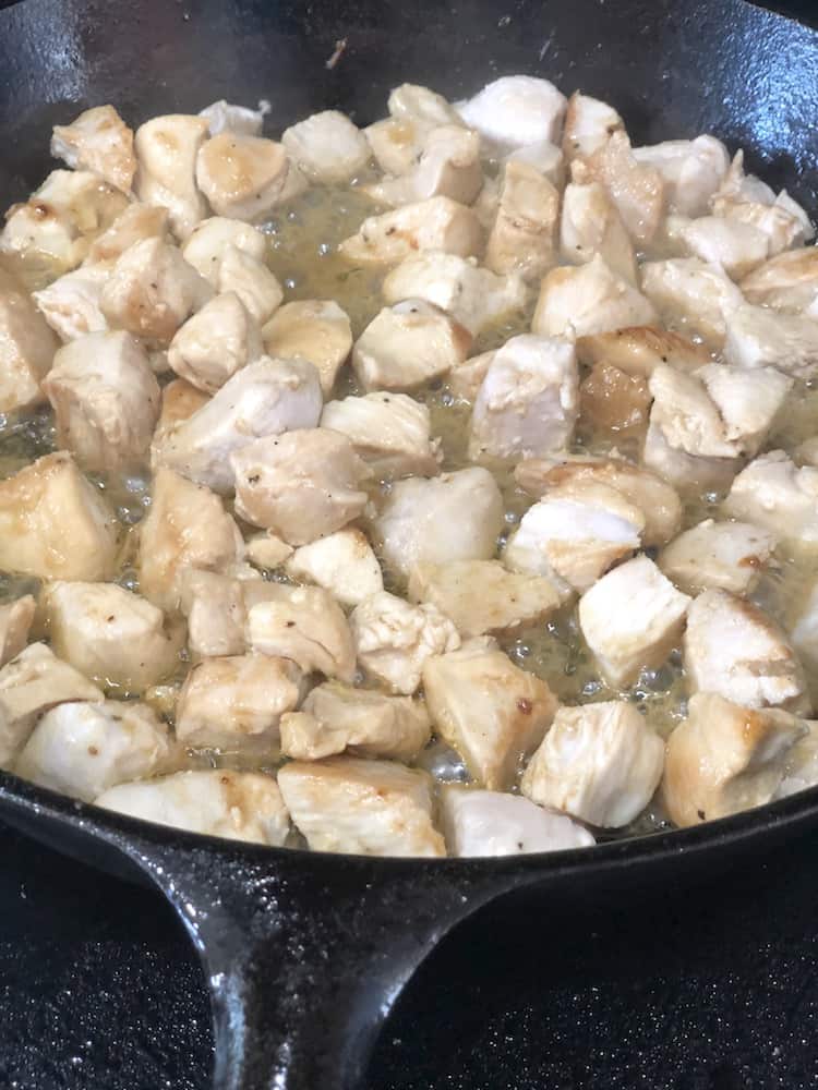 - Add the chicken to the skillet, stirring occasionally until browned and cooked through, for about 8 minutes.