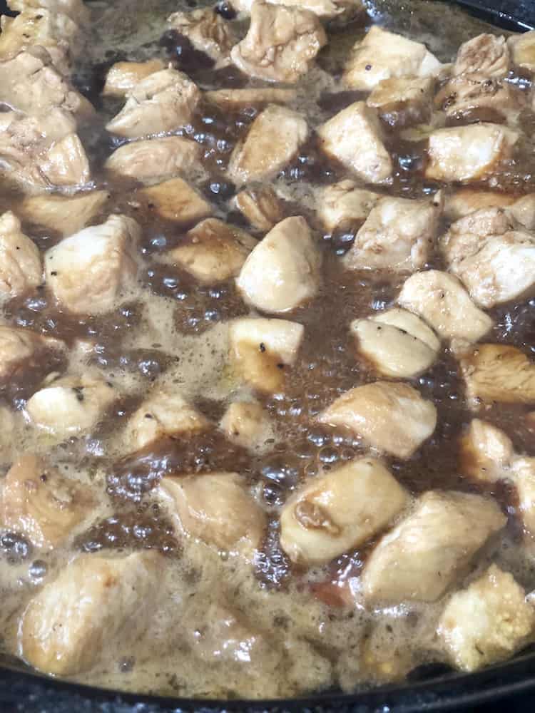 - Once the chicken is cooked completely, add in the soy sauce mixture, and stir it to combine.