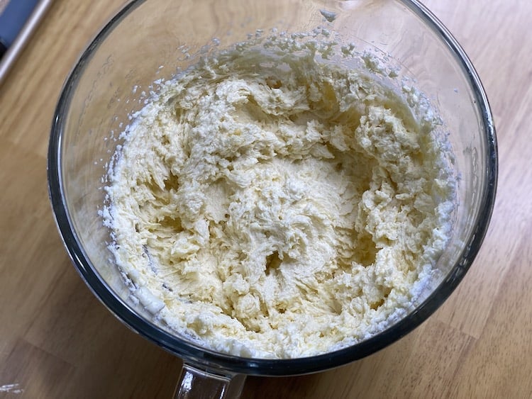 Cream together the butter and sugar until it’s completely mixed with a hand mixer or large mixer. (Be careful not to overmix it.)