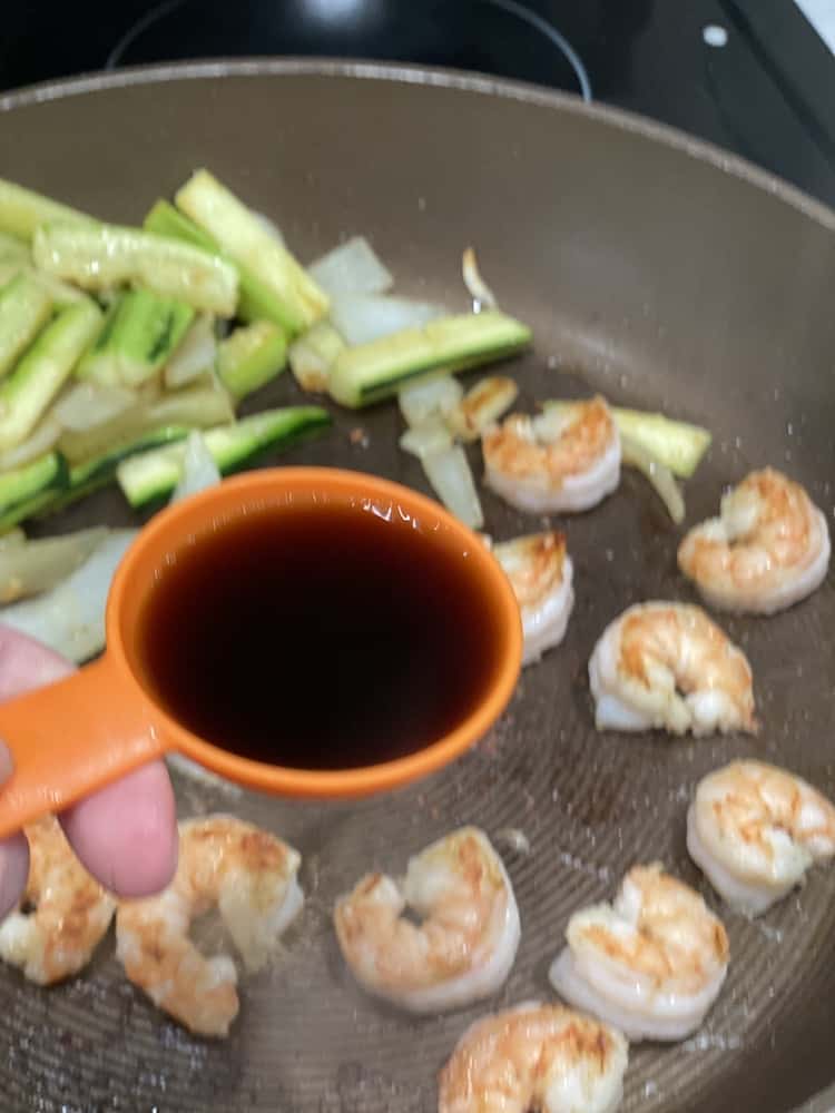 Push the veggies to the side and add the shrimp. Flip the shrimp after about 90 seconds. Cook on the other side until the shrimp cooks completely cooked.