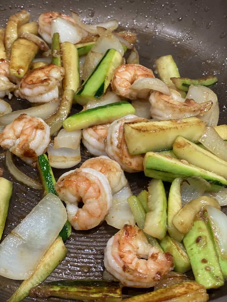 It’s so easy to chop up the sweet onions and zucchini and get it cooking. The cooking process is easy – just add the minced garlic cloves. Push all the veggies to the side and cook the shrimp. This meal is so simple and only uses 1 pan!