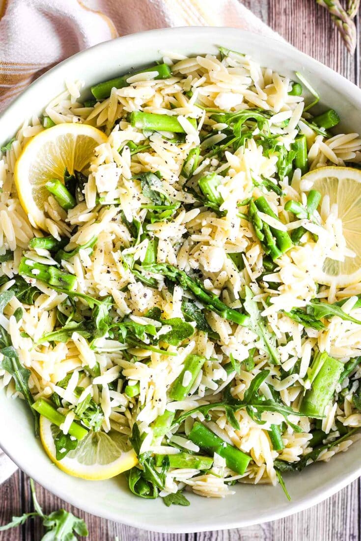 This bright and herbaceous lemon orzo pasta salad with arugula, asparagus, and feta is a delightful side dish celebrating fresh Spring produce