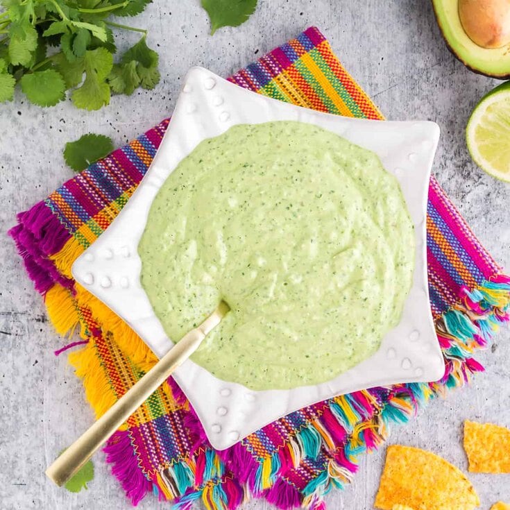 If you are making seafood tacos this sauce looks delicious! A quick and easy green sauce that includes something unique. It's not just sour cream and avocado that make this sauce super smooth and creamy. Add it to tacos, quesadillas, or any other seafood dish.