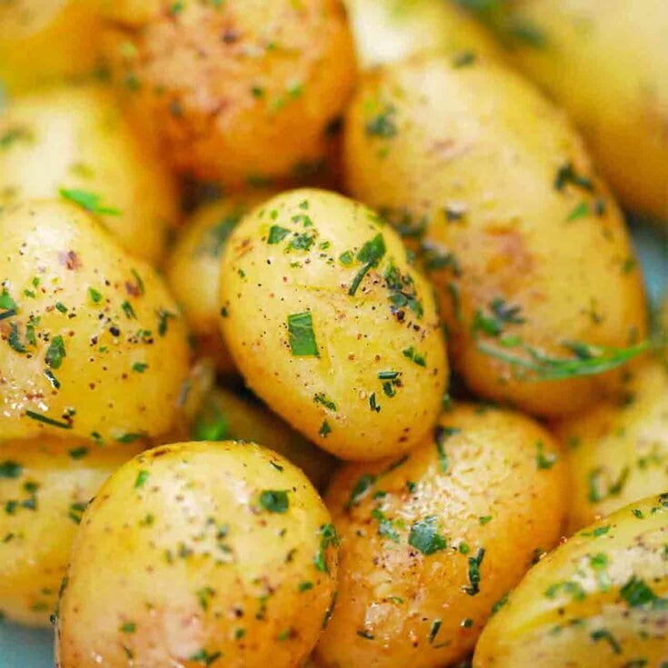 Boiled potatoes are made with new potatoes and they are buttery and delicious. They are made with fresh herbs and drizzled with melted butter and a touch of fragrant olive oil. The insides have a nice creamy texture while the skin is soft and flavorful. This is my favorite way to cook taters and an easy side dish for any dinner.