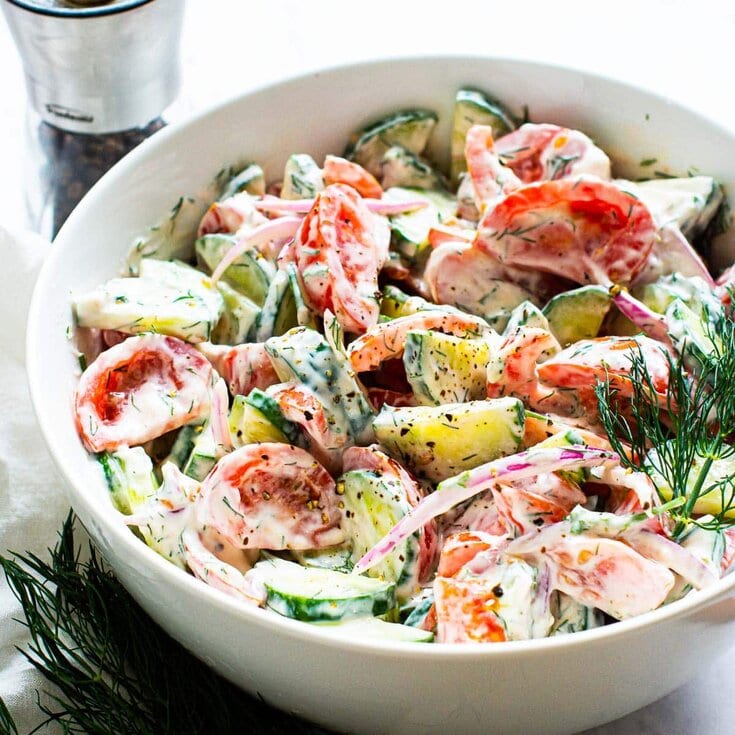 Creamy Cucumber Tomato Salad made with crispy cucumbers, and juicy tomatoes tossed in creamy garlic and fresh dill dressing. It’s 15 minute side dish you will make all summer long!