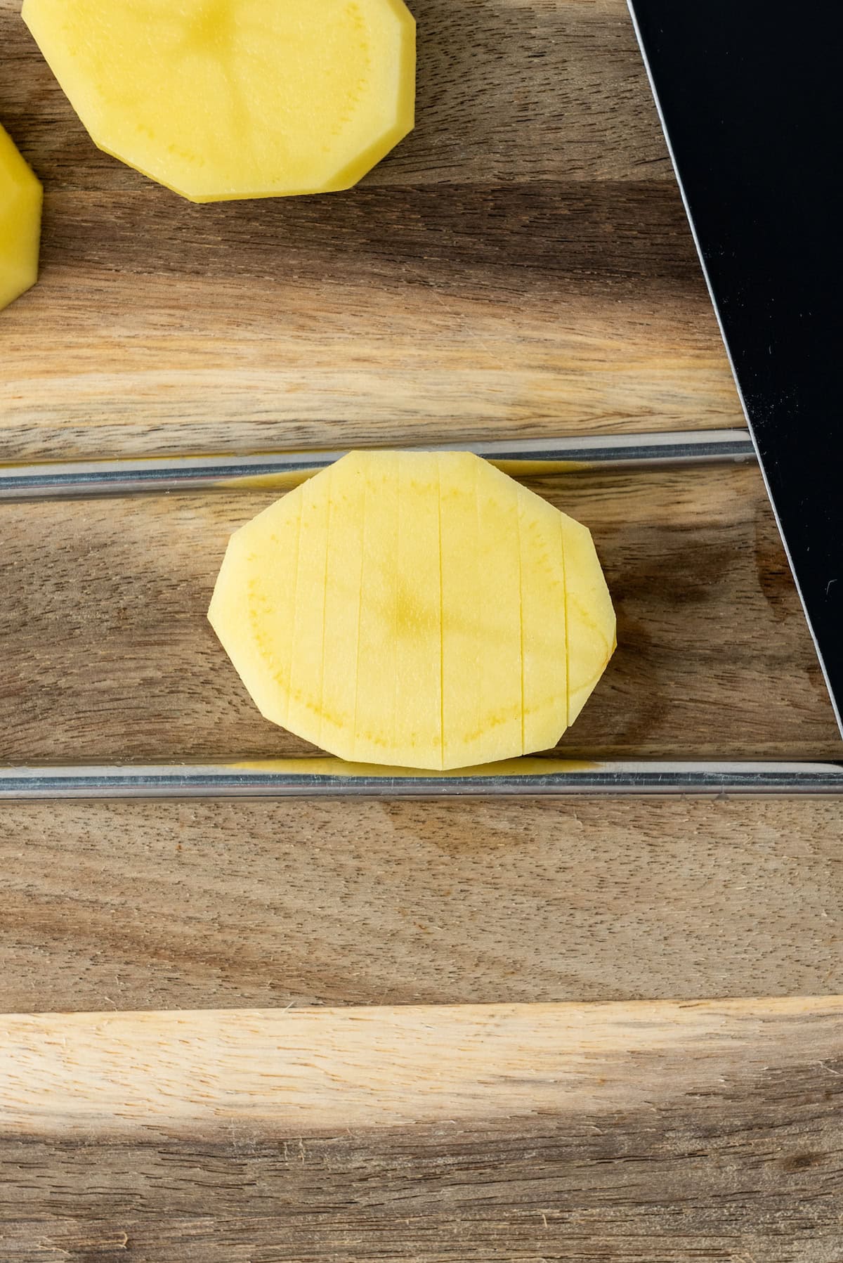 - Place a potato slice on your cutting board and thinly slice verticle lines on one side. Make sure to place chopsticks on each side so you don’t entirely cut the potatoes through the sides of the potato.