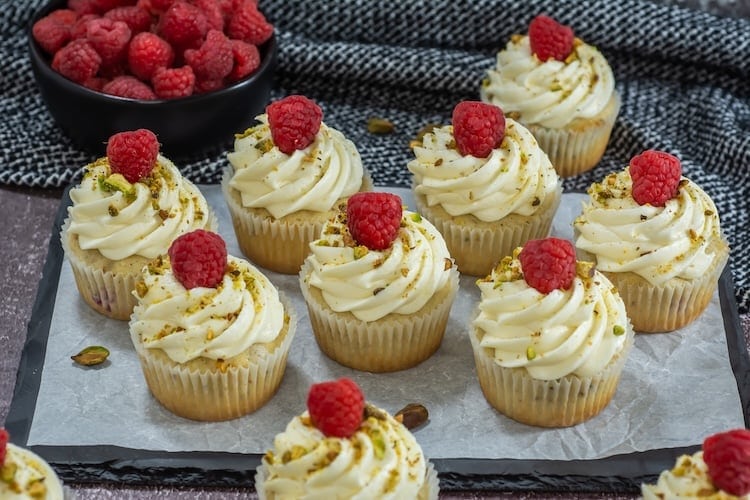 - Pipe a large mound or pipe swirls on top of the cupcakes. Sprinkle with the remaining pistachio pieces and place a raspberry at the peak of each frosted cupcake.