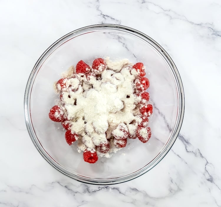 - In a small bowl, gently coat the raspberries in the remaining flour 1/4 cup of flori. Add the floured raspberries to the batter and gently fold to combine.