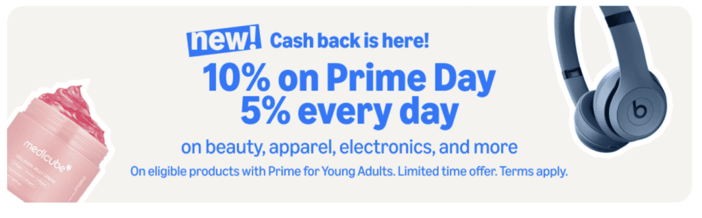 Prime for Young Adults is a discounted Amazon Prime membership designed specifically for people ages 18–24, offering all the perks of a regular Prime membership at half the price. But it doesn’t stop there — this version is upgraded with extra perks tailored to young adults, including limited-time cash back savings on popular categories like beauty, apparel, electronics, and personal care.