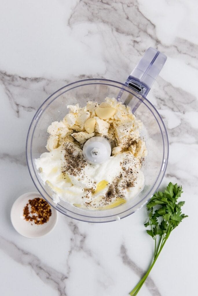 - In a food processor, add the feta cheese, Greek yogurt, olive oil, garlic, lemon juice, salt, and black pepper. Blend until smooth and creamy.