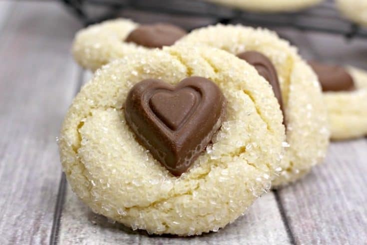 This is a delicious buttery shortbread cookie with crunchy sanding sugar and decadent chocolate hearts that make them irresistible.