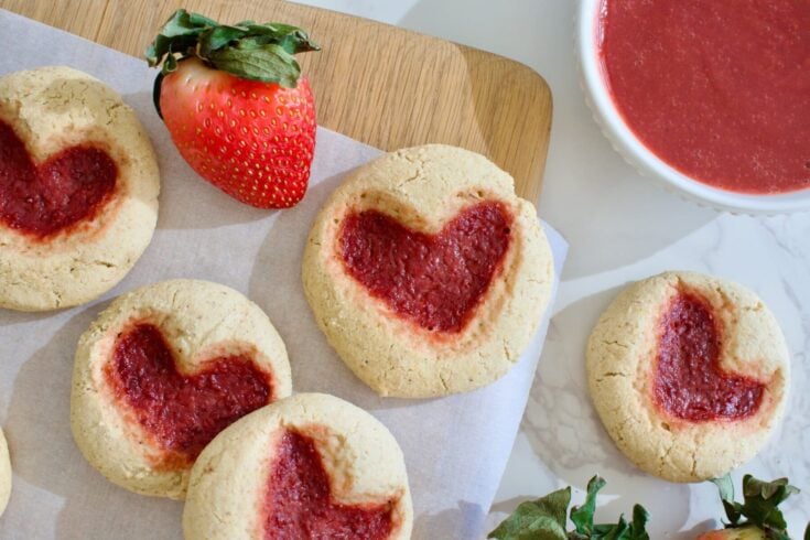 These are perfect gluten free Valentines Day desserts. The jam center makes them festive and flavorful. They are also dairy free, and nut free, so whoever your Valentine is can enjoy this sweet treat.