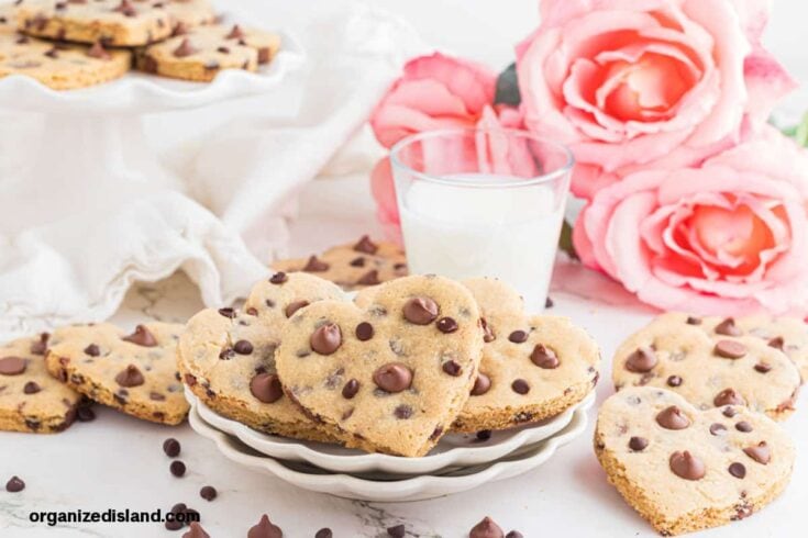 The kids will love these are heart shaped cookies made with chocolate chips. They are delicious, chewy chocolate chip cookies!