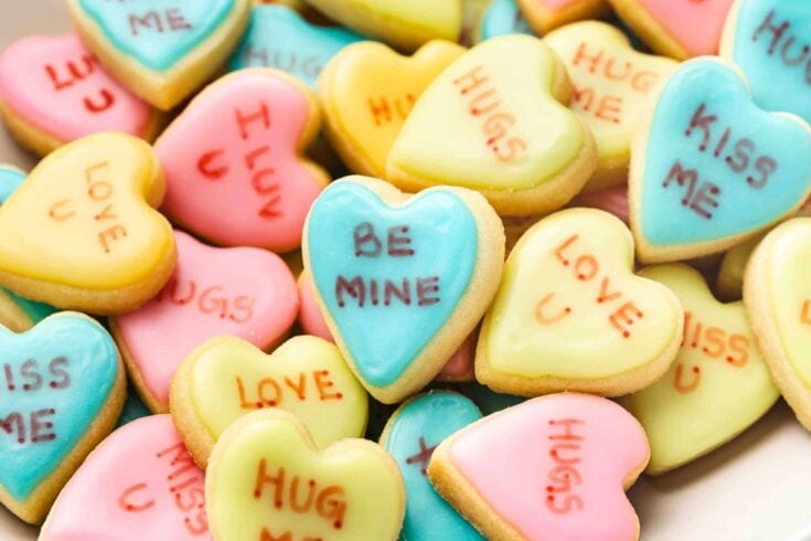 Inspired by classic candy hearts, these cookies are playful Valentines Day food ideas. Their small size makes them perfect Valentines Day treats for sharing. (This is a yummy (Valentine's Sugar Cookie Recipe) They are classic heart shaped cookies and easy Valentine cookie ideas for decorating with kids.
