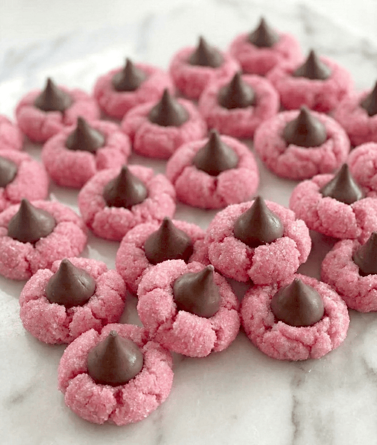 These pink cookies are made with cake mix and topped with chocolate kisses. They are classic kiss cookies, great strawberry cookies, and an easy choice for easy Valentines baking.