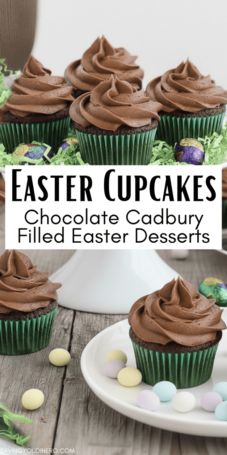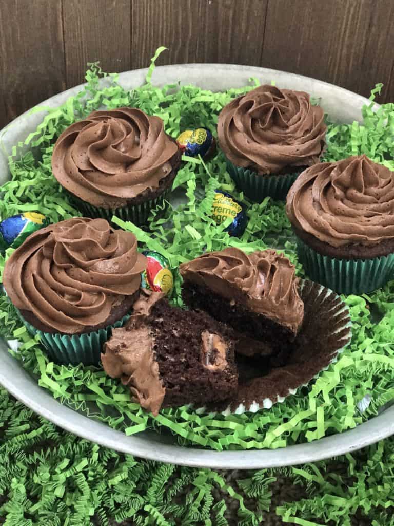 Delicious Easter Cupcakes filled with Cadbury eggs and topped with rich chocolate buttercream. An easy and fun Easter dessert idea.