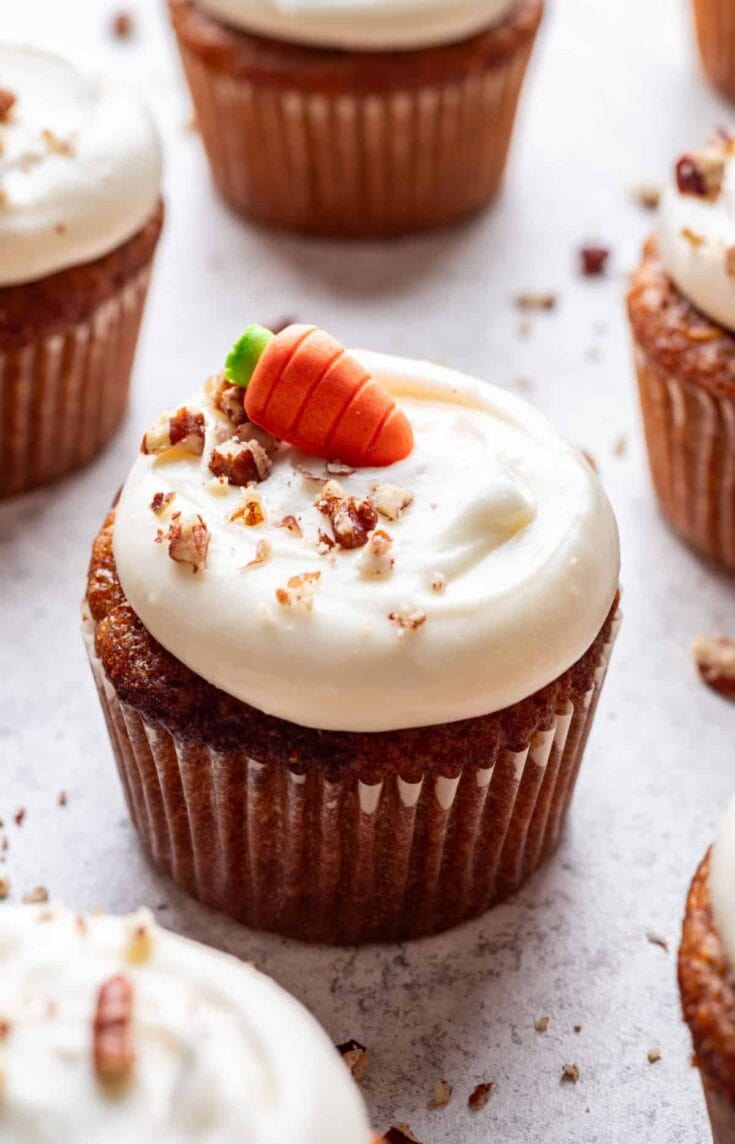 My Carrot Cake Cupcake recipe is an individual serving of a classic! These cupcakes are a great addition to your Easter Sweets list and are topped with creamy frosting. It's easy to decorate each cupcake with a carrot.