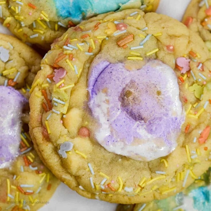Combine soft cookies with marshmallow Peeps for Easter Sweets Ideas that kids will absolutely devour. This no chill recipe in made in 1 bowl! This giant sugar cookie is stuffed with marshmallow Peeps, white chocolate, and sprinkles.
